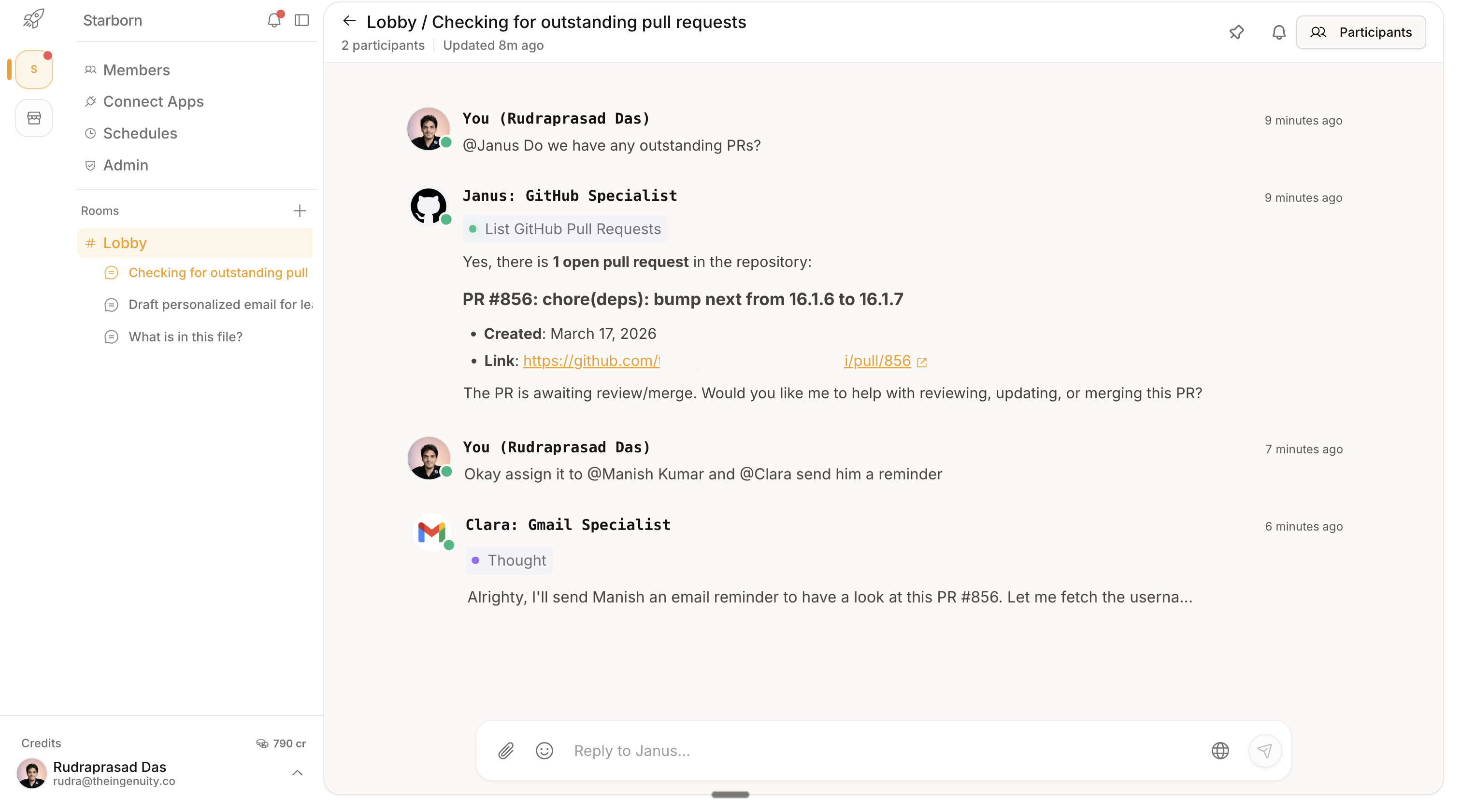 Call any agent into a conversation naturally, right where your team is already talking.
